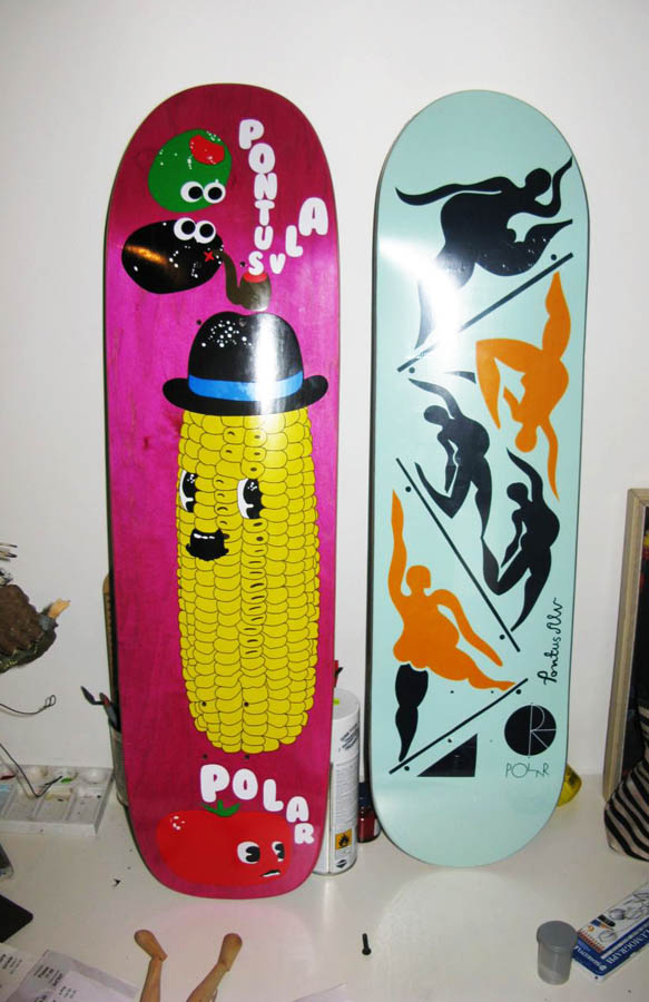 Europas Vorzeige-DIY-Betonvirtuose und Avantgardeskatefilmemacher Pontus Alv hat sich eine neue Herausforderung gesetzt und ist derzeit gerade schwer damit beschäftigt, seine eigene Boardcompany Polar Skate Co. ins laufen zu bringen. Bei einem Workaholic wie Pontus dürfte es allerdings nicht lange dauern bis das Ding steht. Bisher gibt es zwar noch keine Internetseite und bis auf Pontus selbst auch keine Teamfahrer, aber die ersten Bretter sind bereits fertig und können allem Anschein nach Toy Machine’s Ed Templeton schon mal überzeugen.