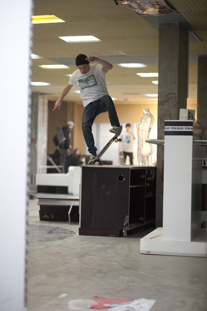 Der alte Laden wurde im Zuge dessen aufgegeben und die komplette Inneneinrichtung verschrottet. Da der Laden recht guten Belag hat und es Mitte März draußen ungemütlich war, erschien es einem skatenden Abrisstrupp eine lustige Idee dabei zu helfen, alles zu Kleinholz zu verarbeiten. An ein paar Tagen in Folge lud der frisch engagierte Titus Berlin TM Adam Sello die Teamfahrer und einige Kumpels ein, dort Session zu machen. Dokumentiert wurde alles von Team-Filmer und -skater Dirk Lamprecht, den Adam als ersten neuen Team-Zugang gewinnen konnte.